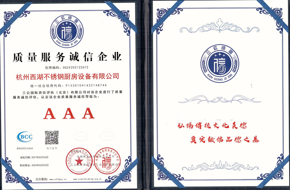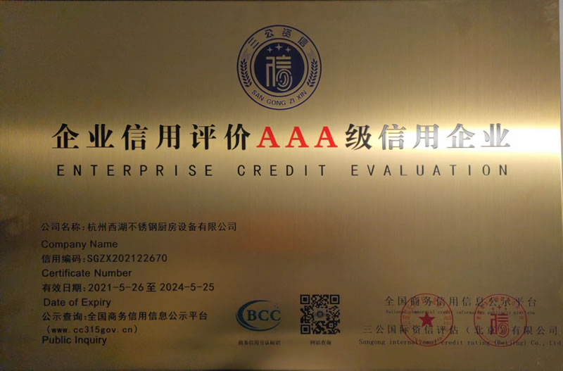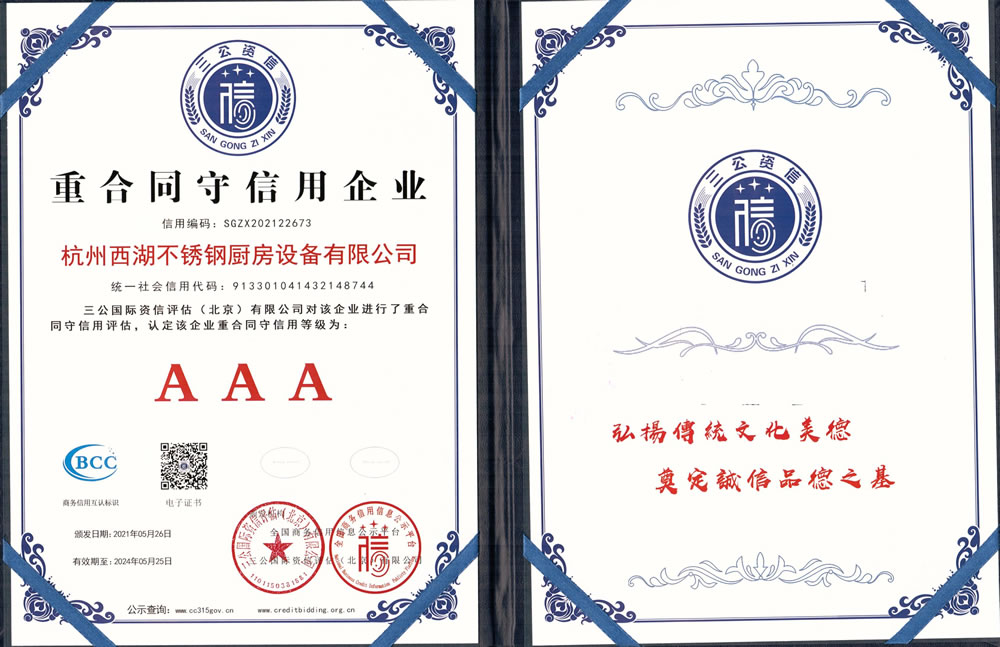 杭州西湖不銹鋼廚房設備有限公司成立20年以來,通過一系列創造性的工作,凝聚企業力量,發揮自身優勢,助推企業發展和品牌建設,取得了一些榮譽,這是廣大西湖廚房設備員工共同努力和各位新老客戶共同支持的結果,我們將再接再厲創造更多的輝煌!